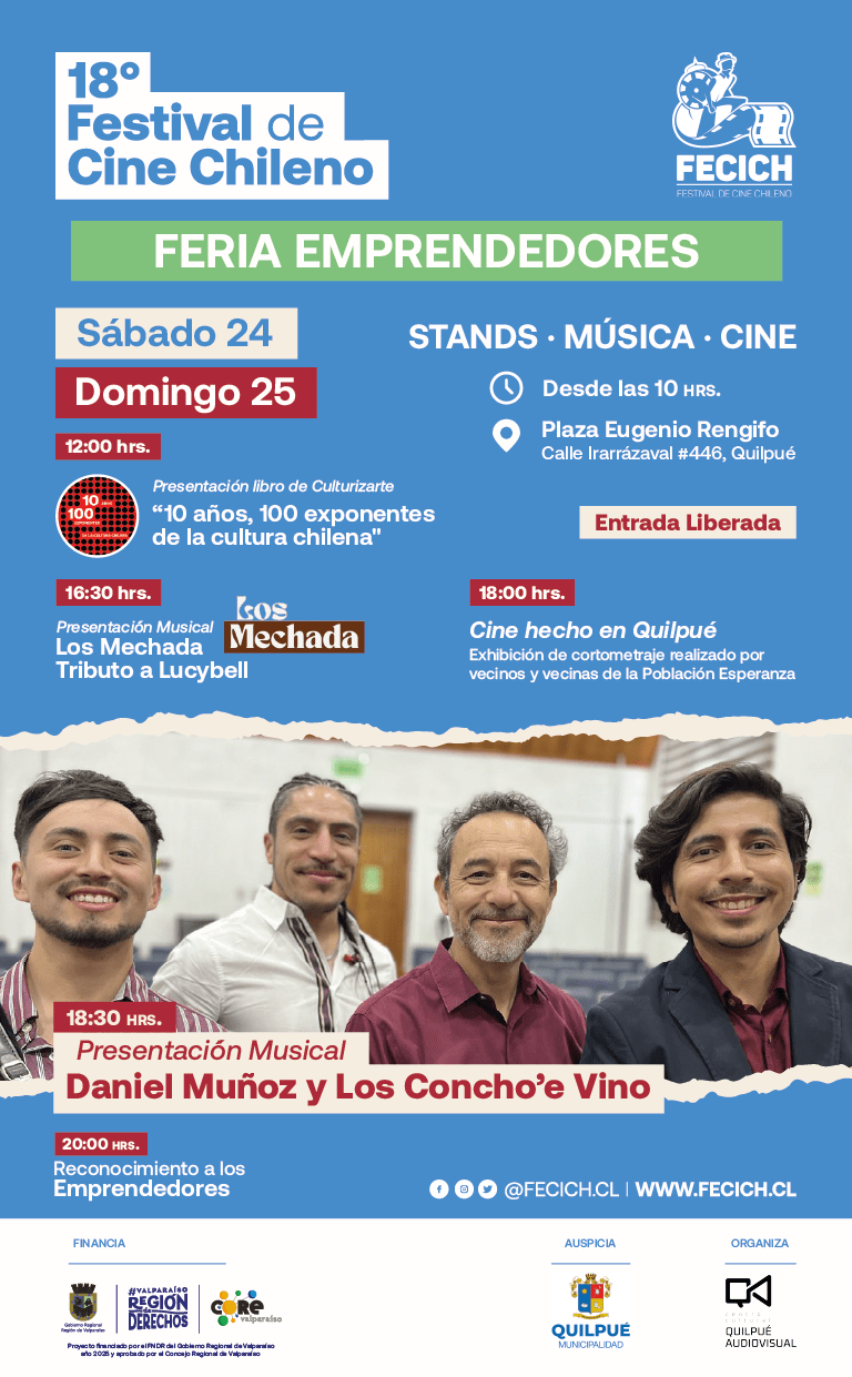 FECICH es organizado por el Centro Cultural Quilpué Audiovisual, financiado por el FNDR del Gobierno Regional de Valparaíso año 2025 y aprobado por el Consejo Regional de Valparaíso; cuenta con el auspicio de la Municipalidad de Quilpué y la colaboración de la Municipalidad de Villa Alemana, EFE Trenes Valparaíso y DUOC UC Sede Viña del Mar.