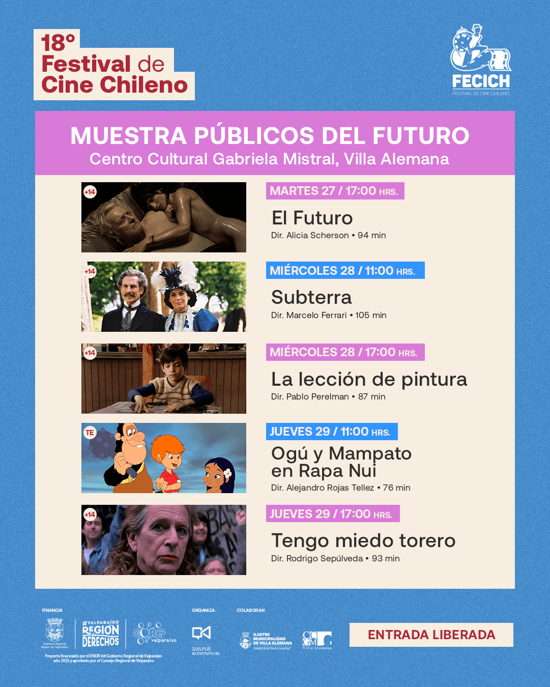 El 18° Festival de Cine Chileno FECICH celebrará una nueva versión en Villa Alemana, reafirmando su presencia en la ciudad de la eterna juventud. En esta edición, el festival realizará la Muestra Públicos del Futuro, dedicada a adaptaciones literarias llevadas a la pantalla grande, y la Muestra Cosecha del Año, selección de estrenos y preestrenos nacionales correspondientes a los años 2025 y 2026.